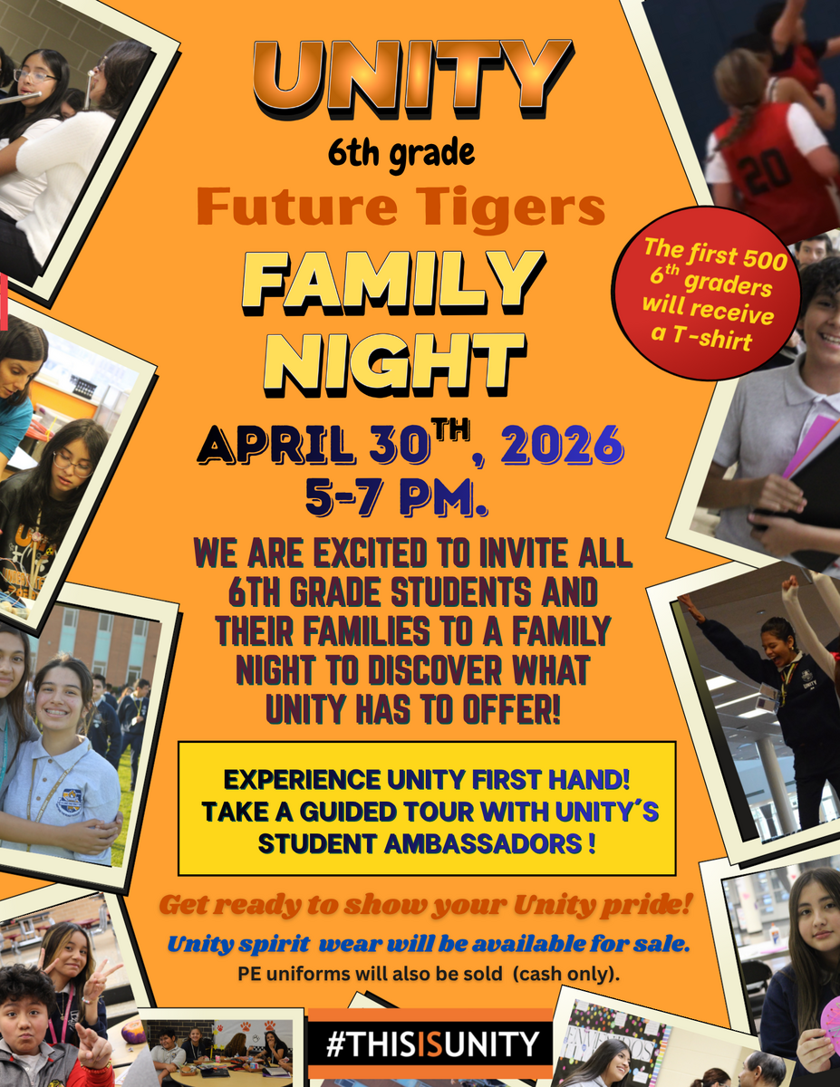 🐯 FUTURE TIGERS: THIS IS YOUR MOMENT! 🔥6th grade families, get ready... because this event is your child's future in motion.📅 Thursday, April 30⏰ 5-7 P.M.You're invited to UNITY's Future Tigers Fam...